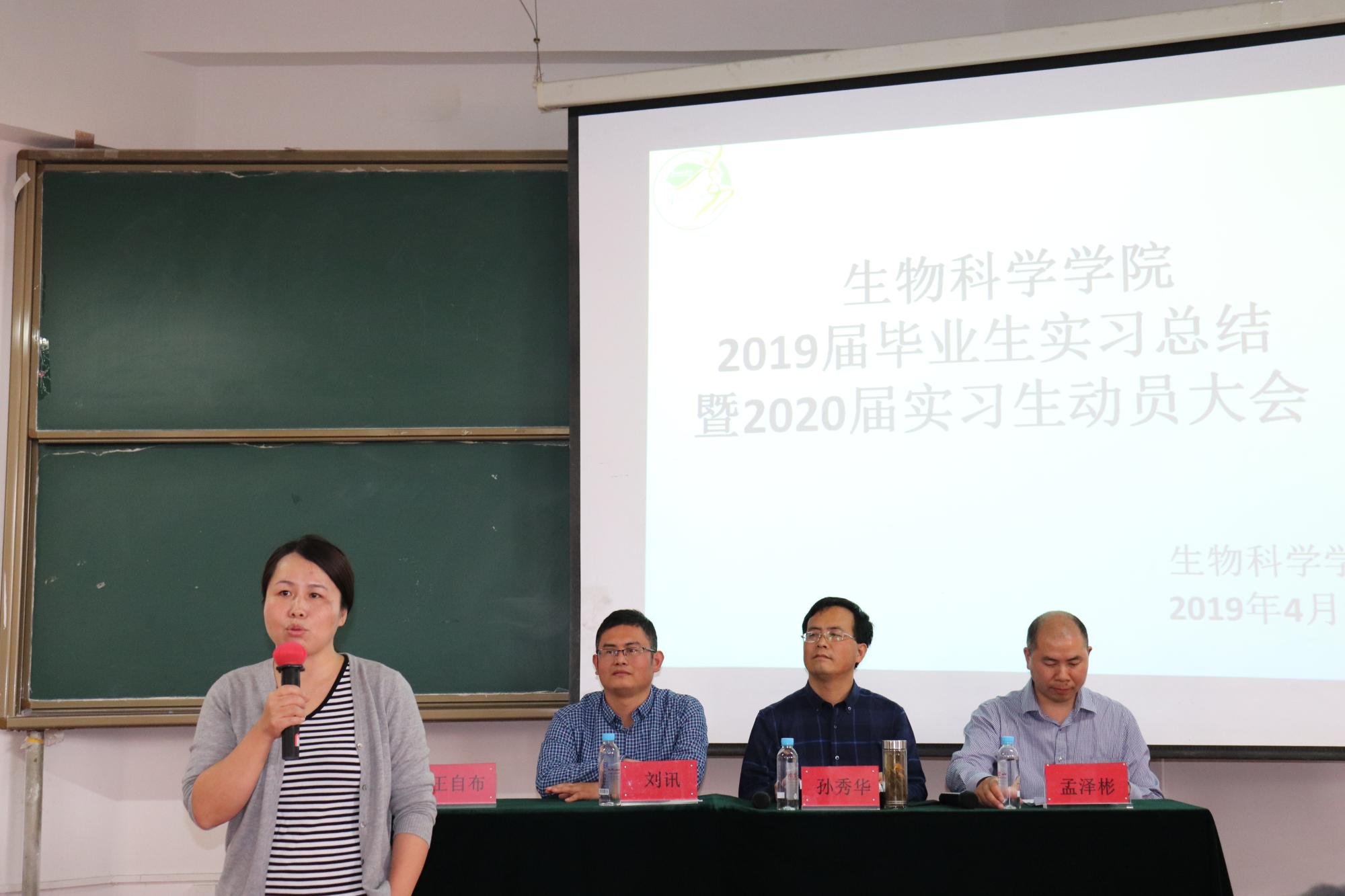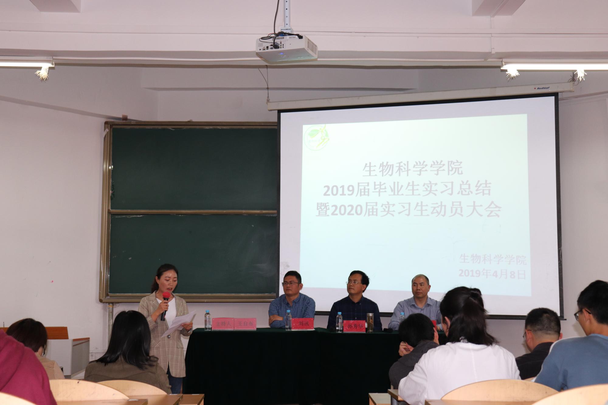 4月8日,生物科學(xué)學(xué)院在寧靜樓537教室召開了“2019屆畢業(yè)生實(shí)習(xí)總結(jié)暨2020屆實(shí)習(xí)生動員大會”。我院黨委副書記孫秀華、副院長劉訊、副院長孟澤彬、系主任王自布,指導(dǎo)教師鄧可、錢長江、符裕紅、廖興剛、劉華濤、劉樹文、夏卉芳、張榮祥、郭玉紅、曹劍鋒、楊燕,輔導(dǎo)員梁濤、李育芳,以及2019、2020屆生物科學(xué)專業(yè)全體學(xué)生參加了此次會議。會議由王自布主持。