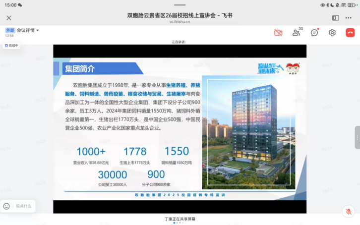 為拓寬畢業(yè)生就業(yè)渠道,搭建高效的供需對接平臺。1月12日下午15:00,生物科學學院在線上舉辦了雙胞胎股份有限公司專場招聘宣講會。學院2026屆部分畢業(yè)生參加了此次宣講 。