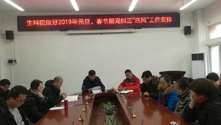 12月28日中午,生物科學(xué)學(xué)院召開教職工大會,傳達(dá)了學(xué)校《關(guān)于做好2019年元旦、春節(jié)期間糾正“四風(fēng)”工作的通知》。要求廣大黨員干部和教師嚴(yán)格按照《通知》要求,認(rèn)真抓好元旦、春節(jié)期間的廉政建設(shè)工作。