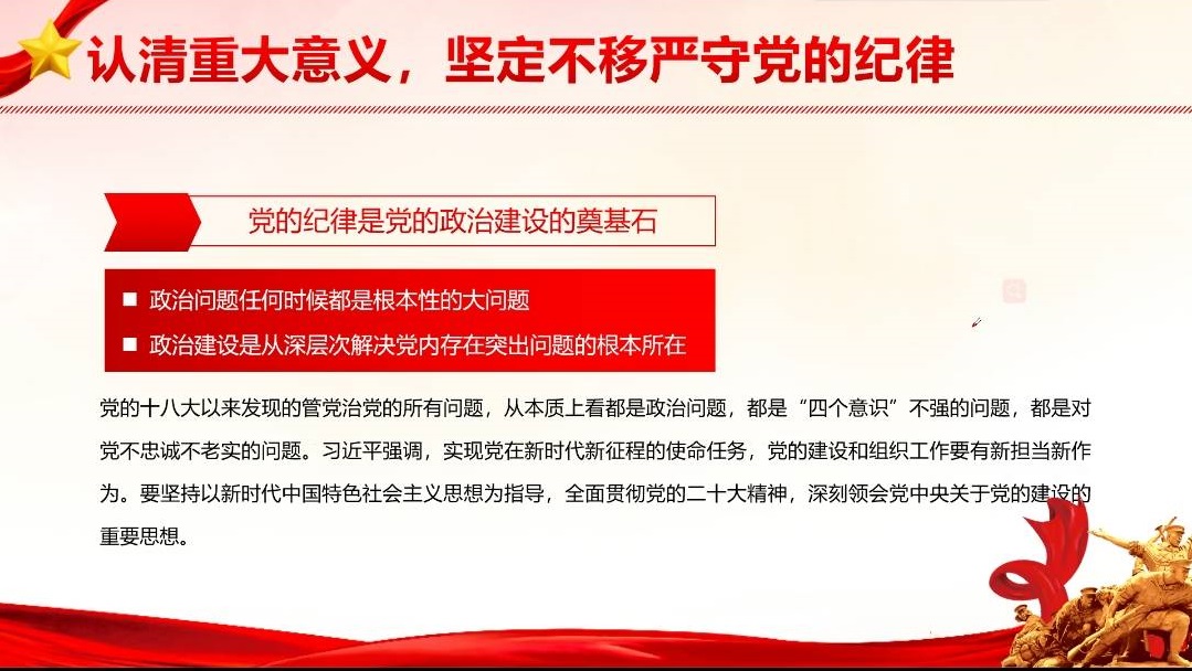 活動(dòng)伊始,楊雨嬌主要介紹了本次活動(dòng)的學(xué)習(xí)內(nèi)容,并指出全面建設(shè)社會(huì)主義現(xiàn)代化國(guó)家、全面推進(jìn)中華民族偉大復(fù)興的關(guān)鍵所在:關(guān)鍵在黨,關(guān)鍵在人。隨后從“認(rèn)清重大意義,堅(jiān)定不移嚴(yán)守黨的紀(jì)律”、“加強(qiáng)黨性修養(yǎng)切實(shí)掌握黨的紀(jì)律內(nèi)容”、“堅(jiān)持自省自勵(lì),自行筑牢違規(guī)違紀(jì)底線”三方面進(jìn)行深入學(xué)習(xí),并強(qiáng)調(diào)了黨的十八大以來(lái)發(fā)現(xiàn)的管黨治黨的所有問題,從本質(zhì)上看都是政治問題,都是“四個(gè)意識(shí)”不強(qiáng)的問題,都是對(duì)黨不忠誠(chéng)不老實(shí)的問題。作為黨員的一份子不僅要全面學(xué)習(xí)和貫徹黨的二十大精神,更應(yīng)該深刻領(lǐng)會(huì)黨中央關(guān)于黨的建設(shè)的重要思想。