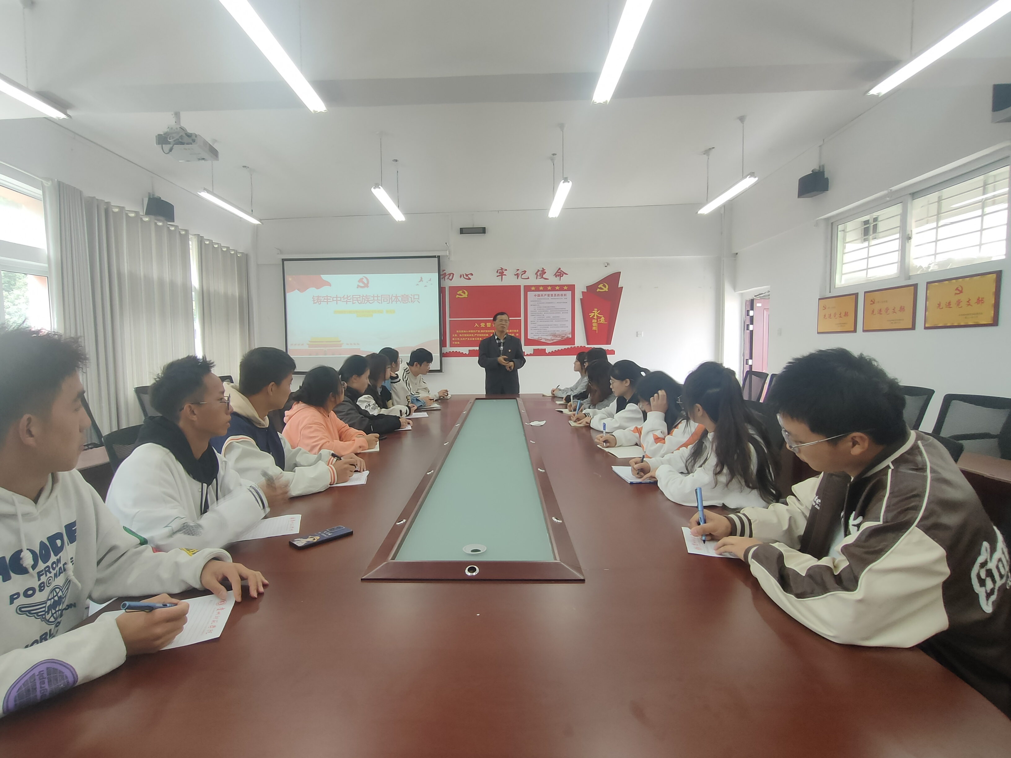 首先,王溯就此次開(kāi)班儀式從培訓(xùn)班班規(guī)紀(jì)律要求及成績(jī)考核規(guī)則進(jìn)行講解,開(kāi)班儀式上不僅介紹了此次培訓(xùn)分為線下和線上結(jié)合的方式進(jìn)行學(xué)習(xí),而且細(xì)化了考核標(biāo)準(zhǔn)。緊接著,孫秀華開(kāi)展《鑄牢中華民族共同體意識(shí)》為主題的專題黨課,從關(guān)于中華民族共同體的提出和中華民族共同體的內(nèi)涵、從輝煌成就詮釋重大意義、三個(gè)民族工作輝煌成就和“八個(gè)堅(jiān)持”等方面對(duì)新時(shí)代鑄牢中華民族共同體意識(shí)的行動(dòng)指南做出了詮釋。最后,師生進(jìn)行合影留念,此次開(kāi)班典禮暨專題黨課圓滿結(jié)束。