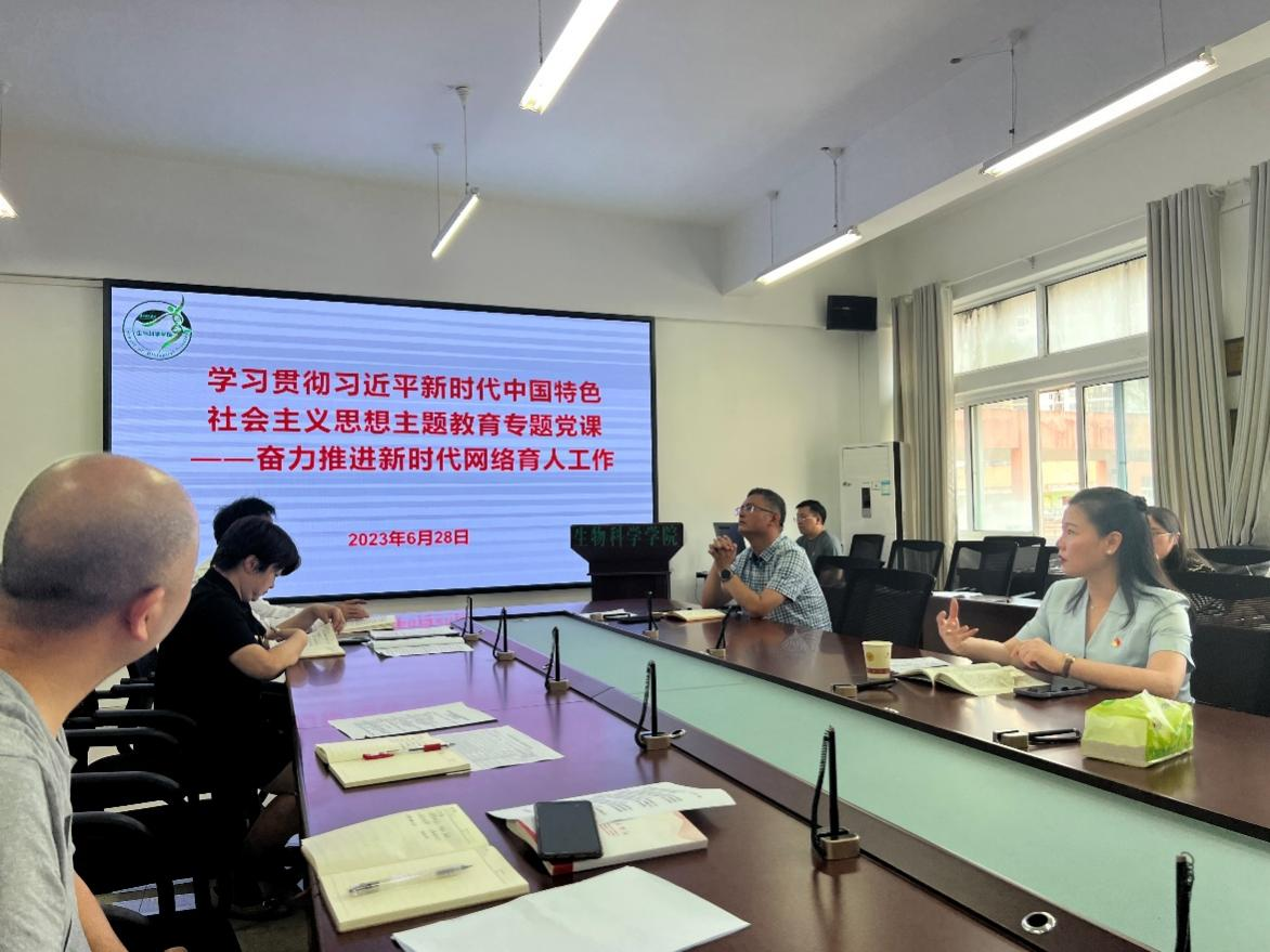 根據(jù)學校學習貫徹習近平新時代中國特色社會主義思想主題教育專題黨課暨“百名書記講黨課”活動的工作安排,生物科學學院6月28日在學院611會議室面向教師黨員和部分學生黨員代表開展了主題為“奮力推進新時代網(wǎng)絡育人工作”的專題黨課。校黨委委員、副校長鄒曉青出席專題黨課并指導,學院黨委書記孫秀華主講,院黨委副書記、院長劉訊主持。