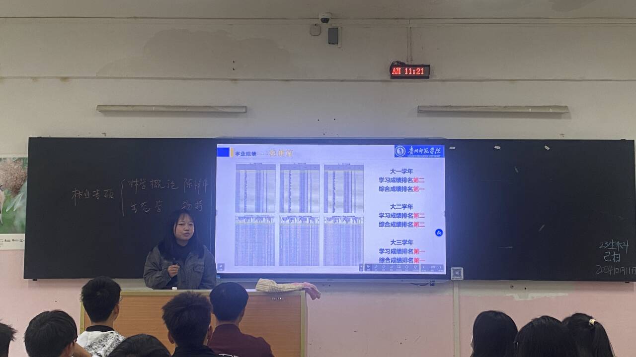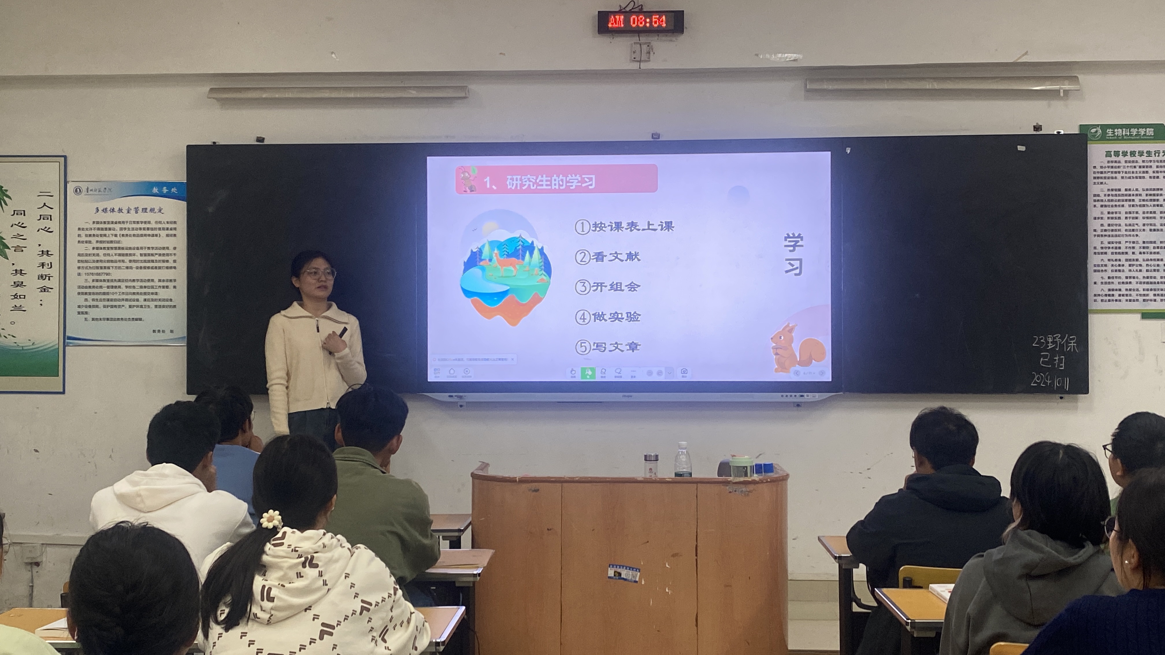 溯心筑夢(mèng)輔導(dǎo)員工作室主持人王溯介紹了本次活動(dòng)目的,并鼓勵(lì)大一新生們勇敢追夢(mèng),向上考研。接著,由兩位生物科學(xué)學(xué)院優(yōu)秀畢業(yè)生、在校研究生代表——東北林業(yè)大學(xué)田玲玲和貴州大學(xué)秦川,分享考研經(jīng)歷、學(xué)習(xí)經(jīng)驗(yàn)。同時(shí),在生物科學(xué)學(xué)院校生代表、國(guó)家獎(jiǎng)學(xué)金獲得者21級(jí)應(yīng)生班羅明宇同學(xué)也分享了自己在學(xué)習(xí)上的獨(dú)到見(jiàn)解和成功經(jīng)驗(yàn)。