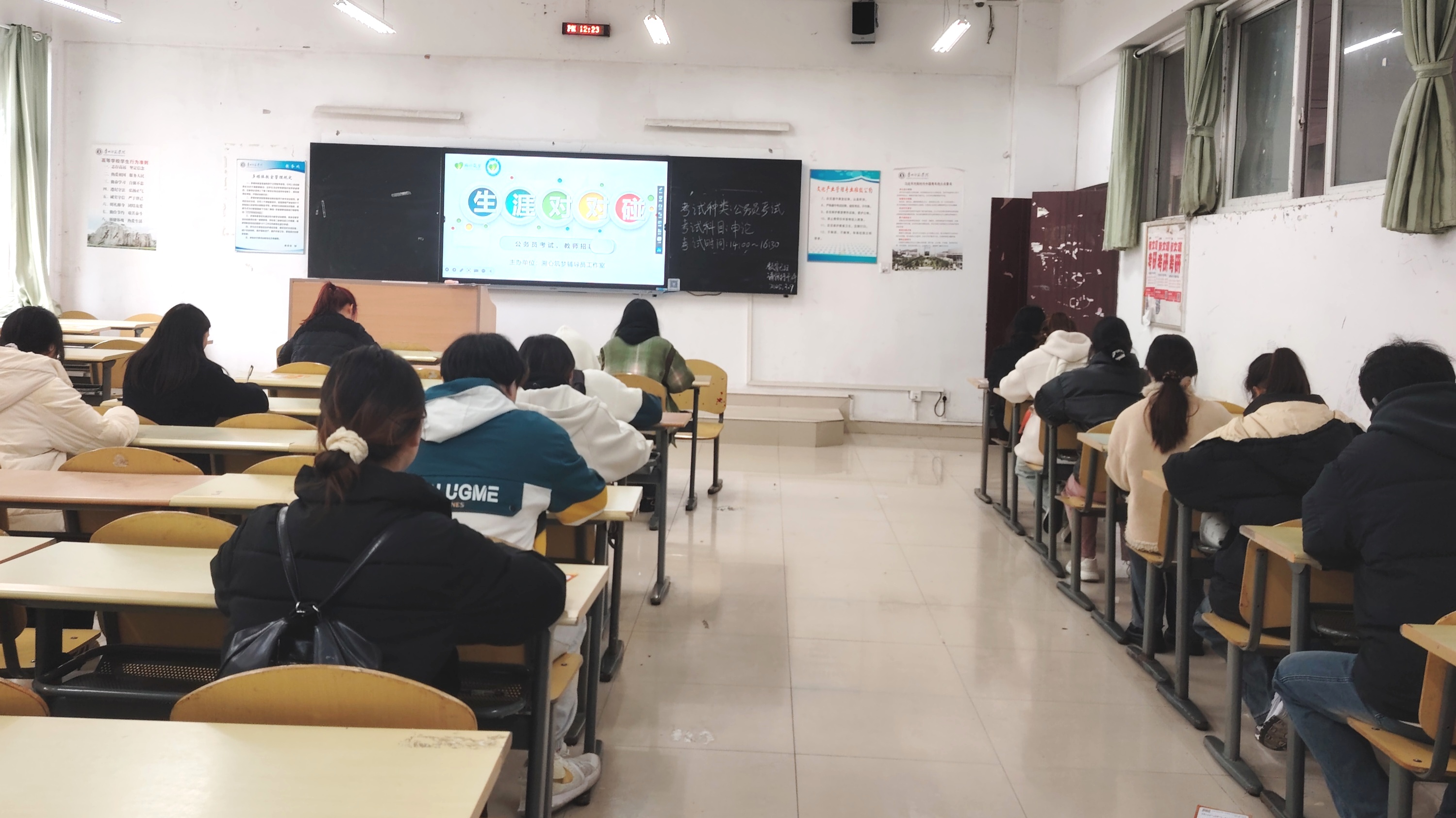為幫助學(xué)生提前熟悉公務(wù)員、教師招聘考試流程,提升備考水平,溯心筑夢輔導(dǎo)員工作室于3月9日在逸夫樓203和204教室舉辦了“生涯‘對(duì)對(duì)碰’”主題考試活動(dòng),此次活動(dòng)吸引了眾多大三、大四備考學(xué)生參與。本次模擬考試旨在通過實(shí)戰(zhàn)演練,幫助學(xué)子提前規(guī)劃職業(yè)路徑,增強(qiáng)應(yīng)試信心。此次活動(dòng)仿真模擬考試,嚴(yán)格按照國考標(biāo)準(zhǔn)命題,同時(shí)還原真實(shí)考場環(huán)境,讓學(xué)生提前感受考試氛圍。考試分為教師招考、省公務(wù)員行測和申論A類試卷考試。