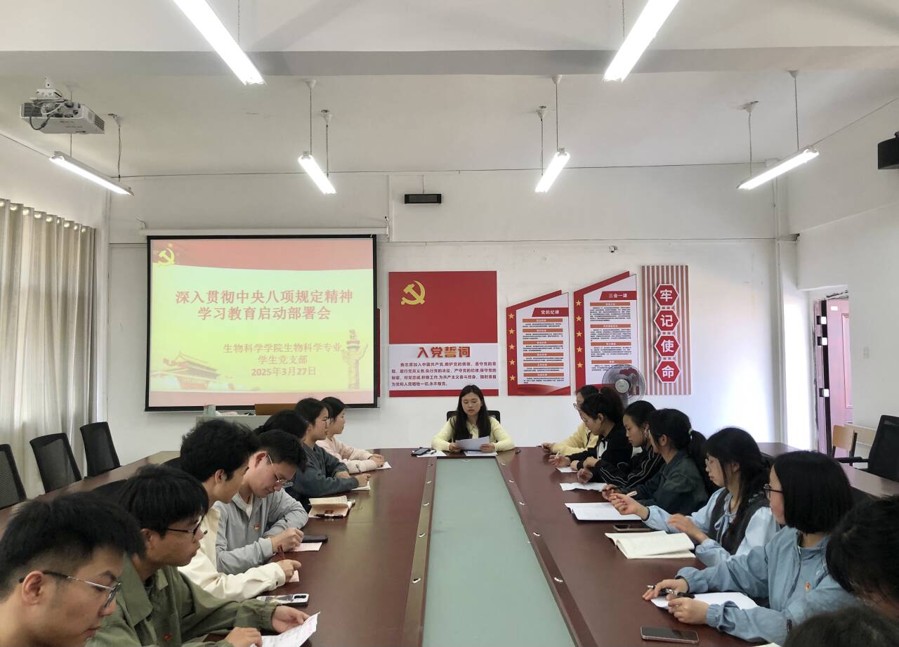 為貫徹落實(shí)黨的二十屆三中全會(huì)部署,鞏固拓展學(xué)習(xí)貫徹習(xí)近平新時(shí)代中國(guó)特色社會(huì)主義思想主題教育成果,鞏固深化黨紀(jì)學(xué)習(xí)教育成果,鍥而不舍落實(shí)中央八項(xiàng)規(guī)定精神,生物科學(xué)學(xué)院生物科學(xué)專業(yè)學(xué)生黨支部于3月27日組織開(kāi)展了深入貫徹中央八項(xiàng)規(guī)定精神學(xué)習(xí)教育啟動(dòng)會(huì)。會(huì)議由黨支部書記王溯主持,全體黨員及入黨積極分子參加會(huì)議。