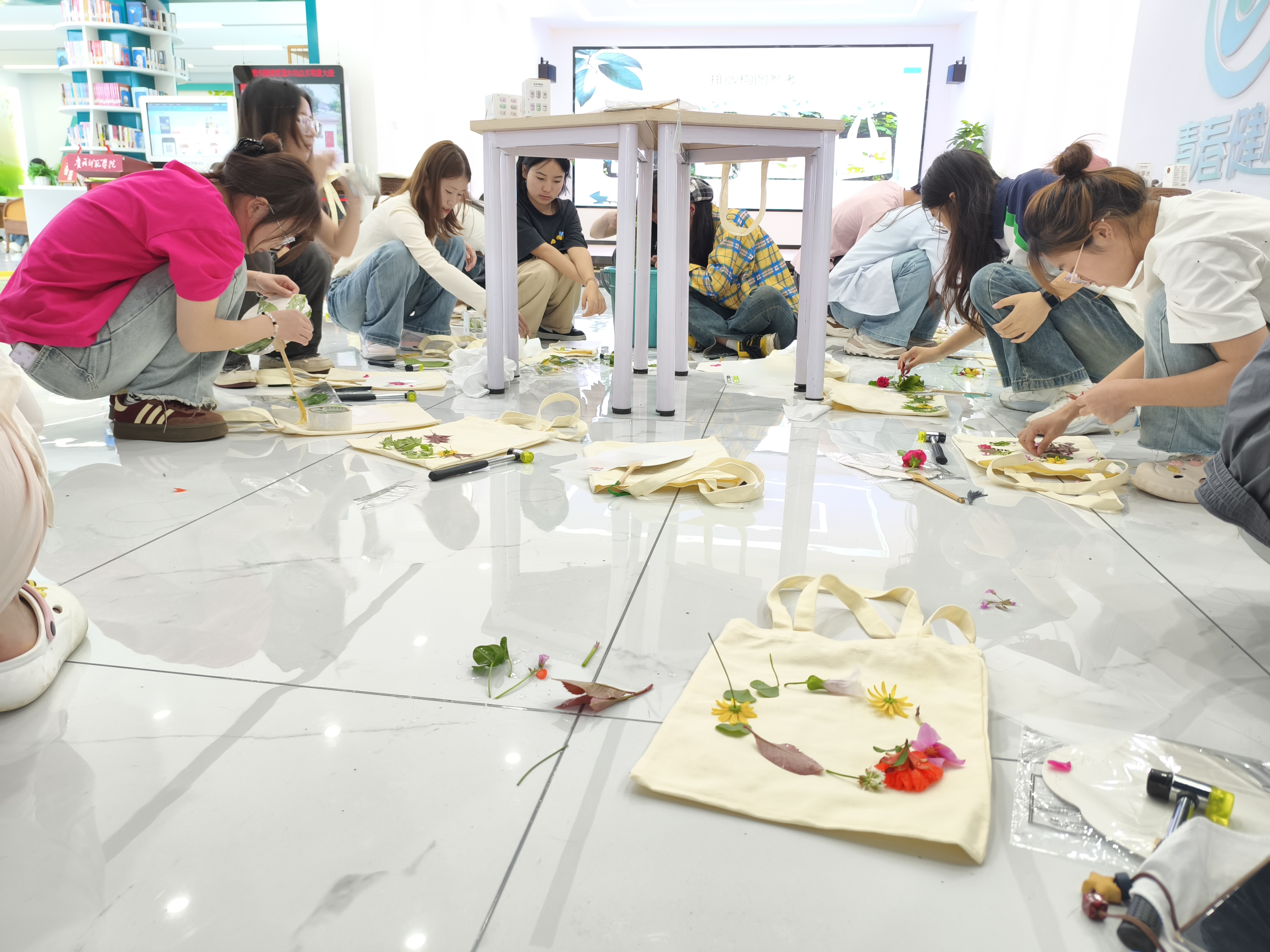 在植物拓印環(huán)節(jié),工作人員孫國鮮詳細(xì)講解了拓印技巧并現(xiàn)場示范。同學(xué)們充分發(fā)揮創(chuàng)意,將葉片、花瓣精心排列在帆布袋、T恤、扇子以及手帕上,通過敲打拓印出自然的紋路與色彩。每一件作品都承載著獨(dú)特的構(gòu)思,展現(xiàn)了參與者對美的感知與內(nèi)心的表達(dá)。創(chuàng)作完成后,大家踴躍分享作品背后的故事,并在交流群中展示成果。最終,工作人員評選出優(yōu)秀作品,并頒發(fā)藍(lán)牙音響、水杯、玩偶雙肩包等獎品。