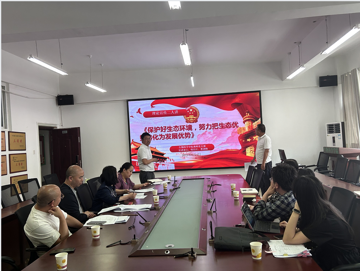 生物科學(xué)學(xué)院教師黨支部于6月4日中午,在寧?kù)o樓611開(kāi)展《保護(hù)好生態(tài)環(huán)境,努力把生態(tài)優(yōu)勢(shì)轉(zhuǎn)化為發(fā)展優(yōu)勢(shì)》“理論宣講二人講”,由教師黨支部書(shū)記、副院長(zhǎng)錢(qián)長(zhǎng)江及教授曹劍鋒主講,支部全體黨員參加了本次宣講活動(dòng)。