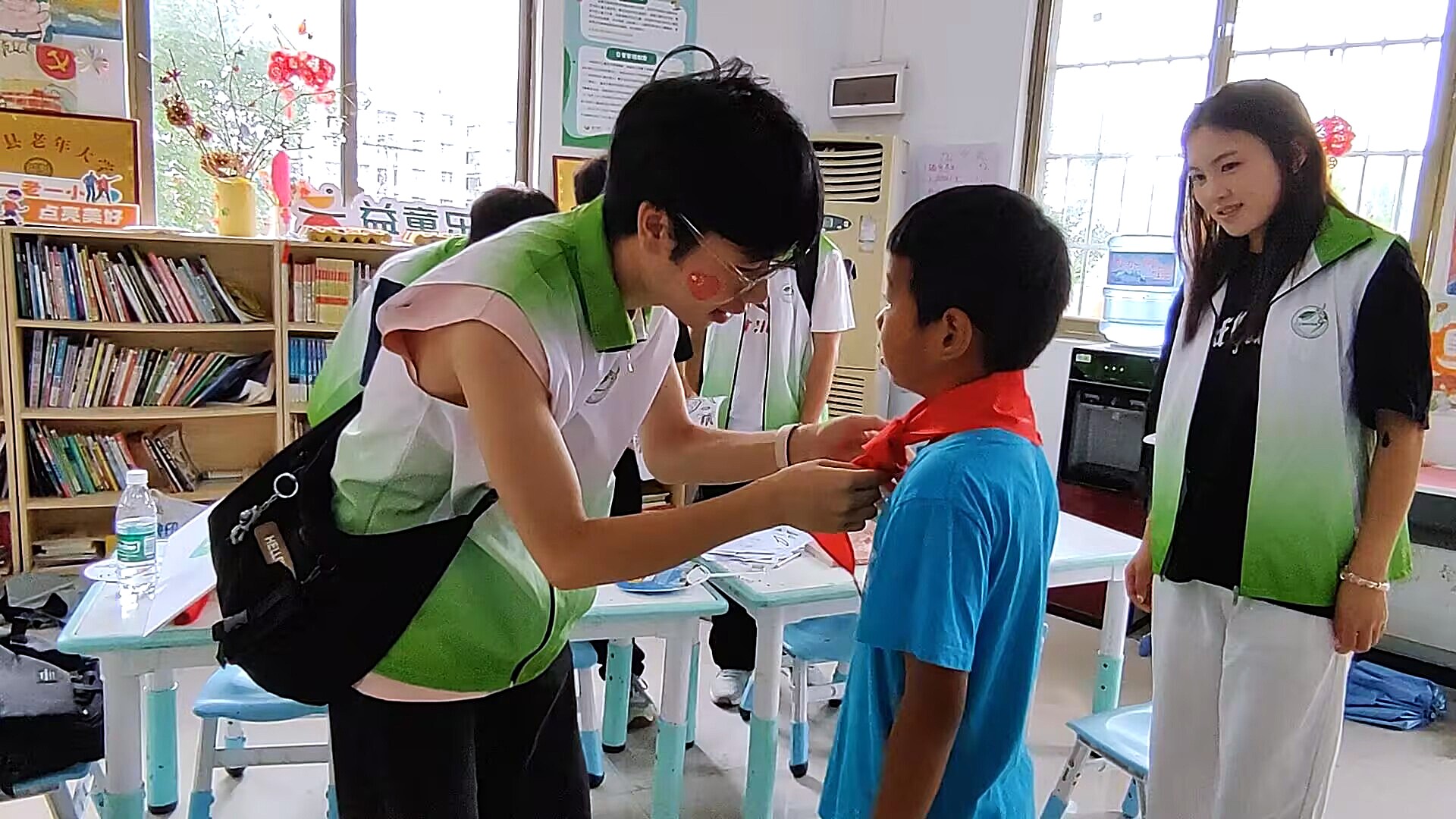志愿者隊(duì)長(zhǎng)為小朋友佩戴紅領(lǐng)巾