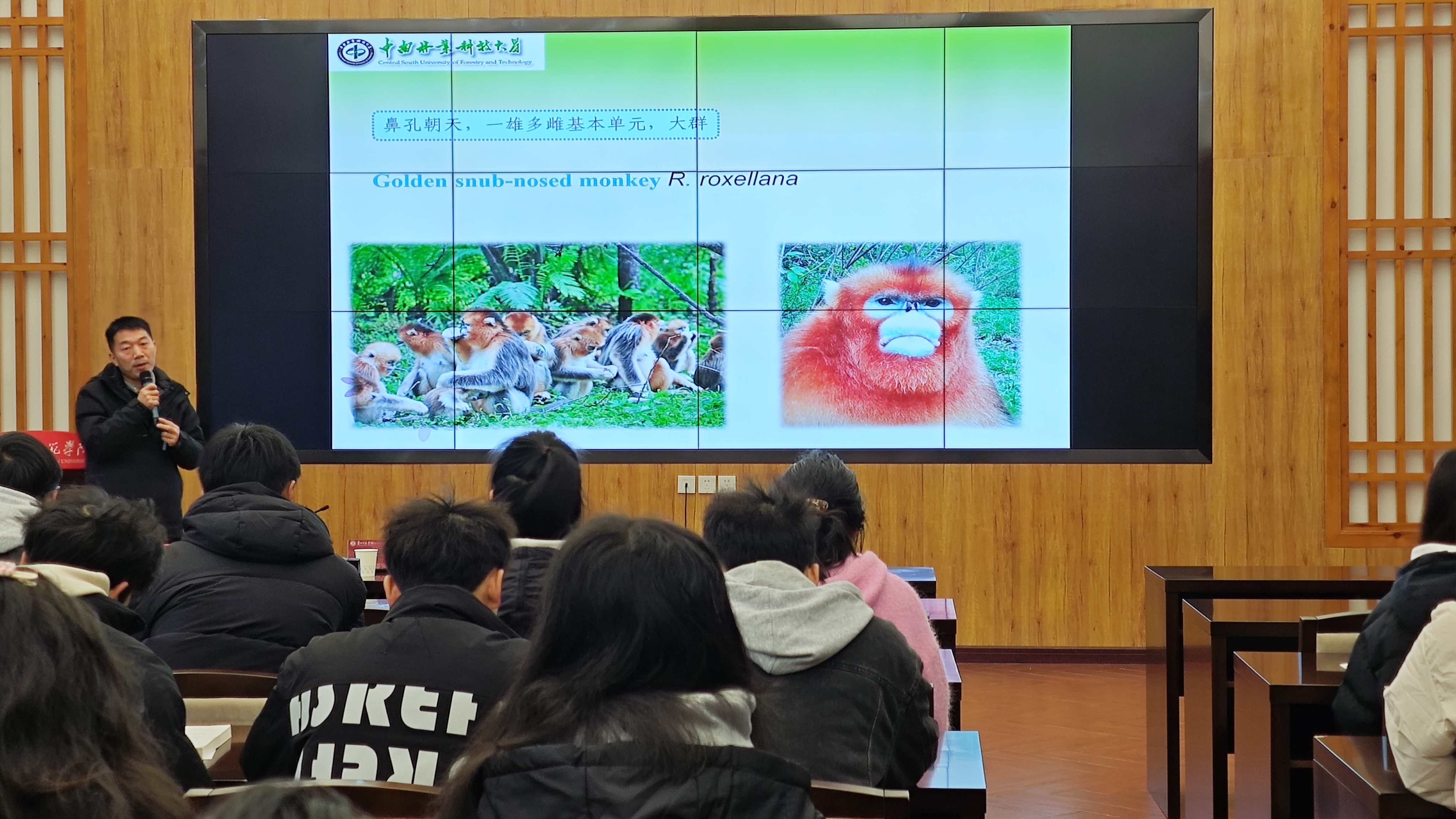 3月7日,貴州師范學(xué)院印山書院山骨講堂迎來湖南省芙蓉學(xué)者特聘教授,中南林業(yè)科技大學(xué)二級教授,博士生導(dǎo)師向左甫教授的學(xué)術(shù)講座——《金絲猴繁殖適應(yīng)策略》,將金絲猴的“家庭”與“社會”生動的呈現(xiàn)在生物科學(xué)學(xué)院師生眼前。講座由生物科學(xué)學(xué)院副院長錢長江主持。生物科學(xué)學(xué)院院長任翠娟、副院長孟澤彬、部分青年教師、野生動物與自然保護管理專業(yè)、生物科學(xué)專業(yè)和應(yīng)用生物科學(xué)專業(yè)的學(xué)生參加講座。