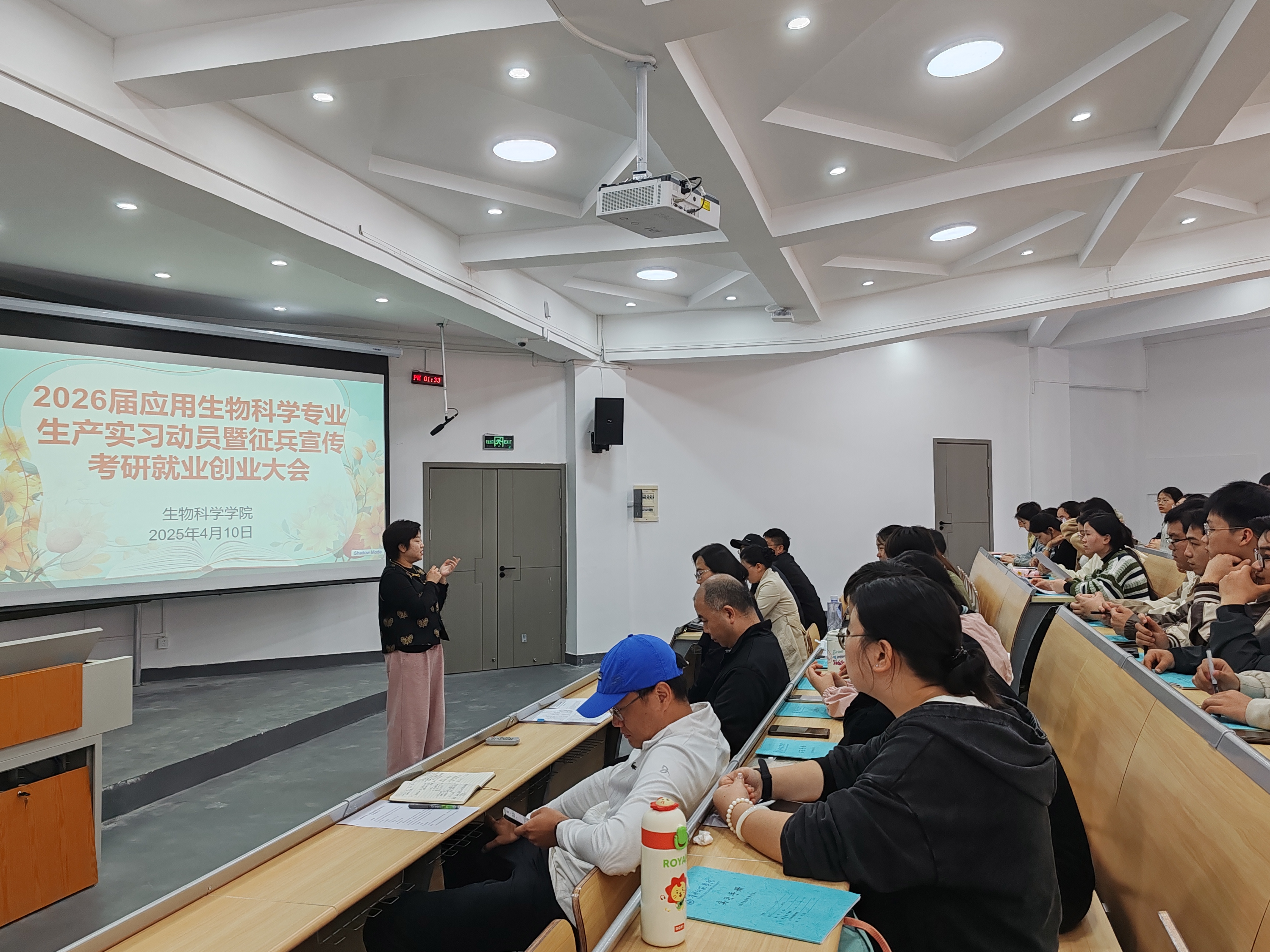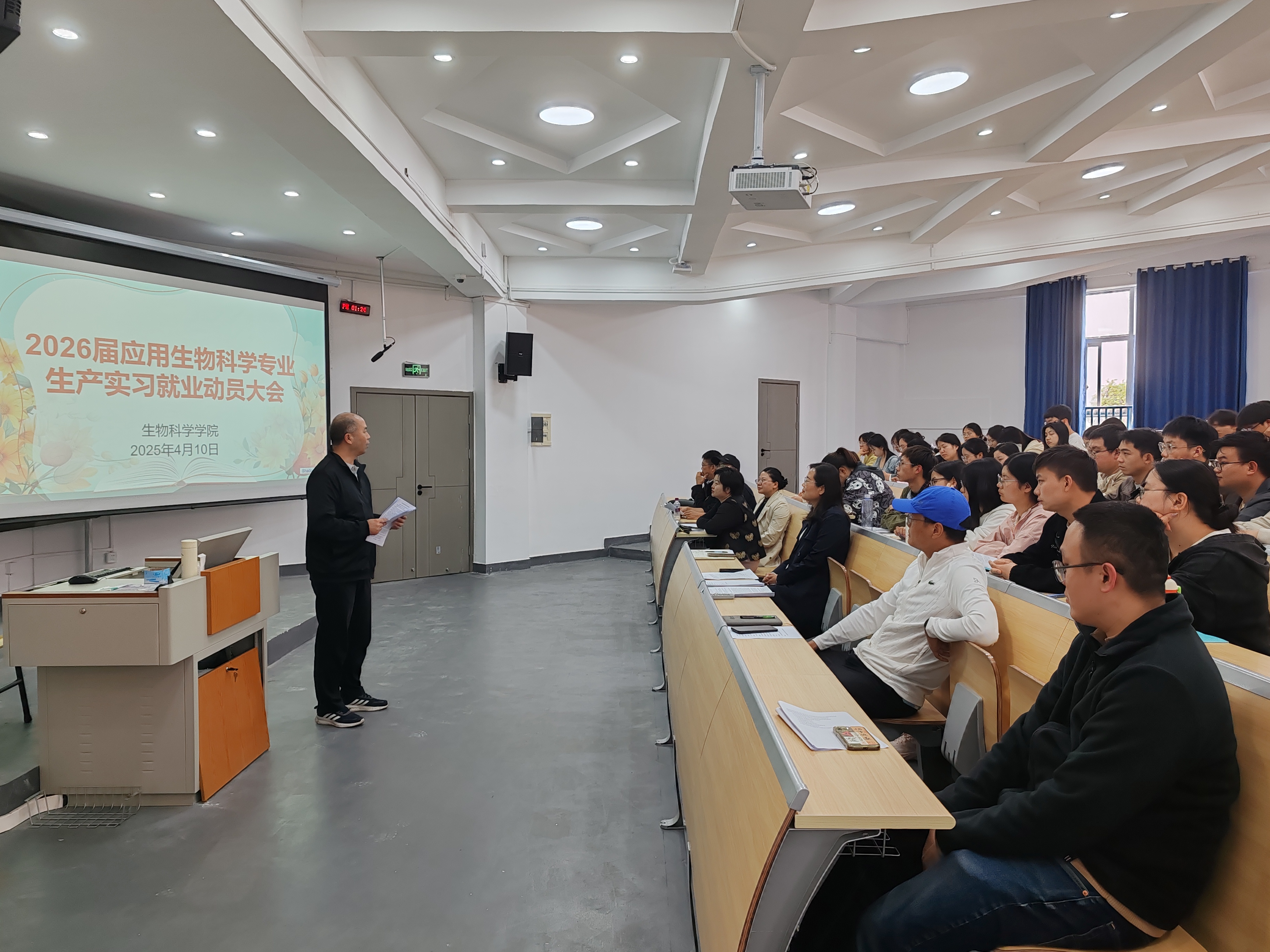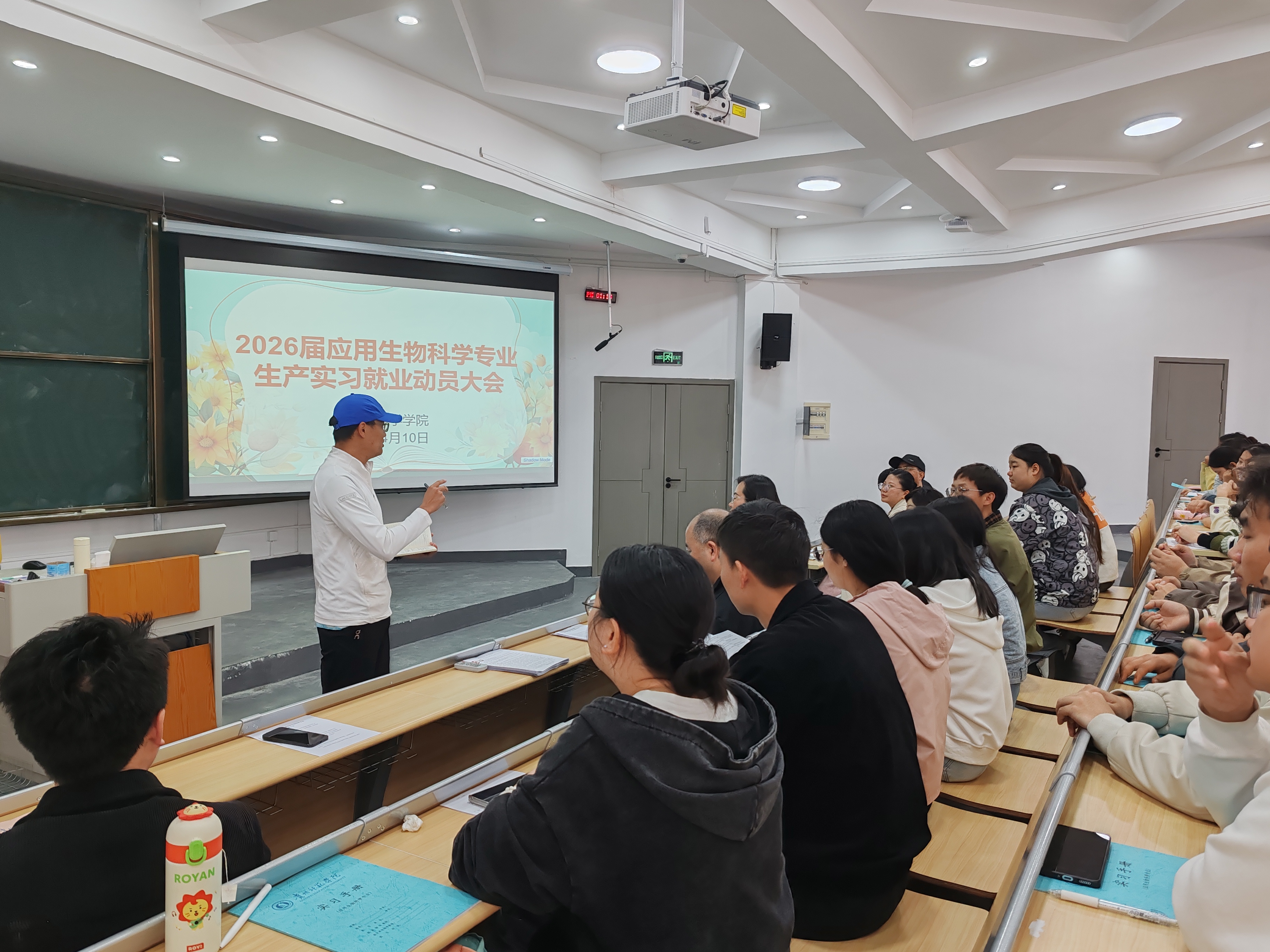 為深化產(chǎn)教融合、落實實踐育人理念,進一步推動應用生物科學專業(yè)學生理論與實踐能力雙提升,生物科學學院于4月10日在寧靜樓537教室召開了2026屆應用生物科學專業(yè)生產(chǎn)實習動員總結(jié)暨征兵宣傳考研就業(yè)創(chuàng)業(yè)大會。參加會議的有學院黨委書記孫秀華、院長兼黨委副書記任翠娟、黨委副書記王玨、副院長錢長江、副院長孟澤彬、系主任程搏幸、輔導員李育芳、生產(chǎn)實習兼職管理員陳運澤、學生導師彭雪梅、學生導師蘭世超、2022級應用生物科學專業(yè)全體同學及2021級應用生物科學專業(yè)學生代表,會議由陳運澤主持。