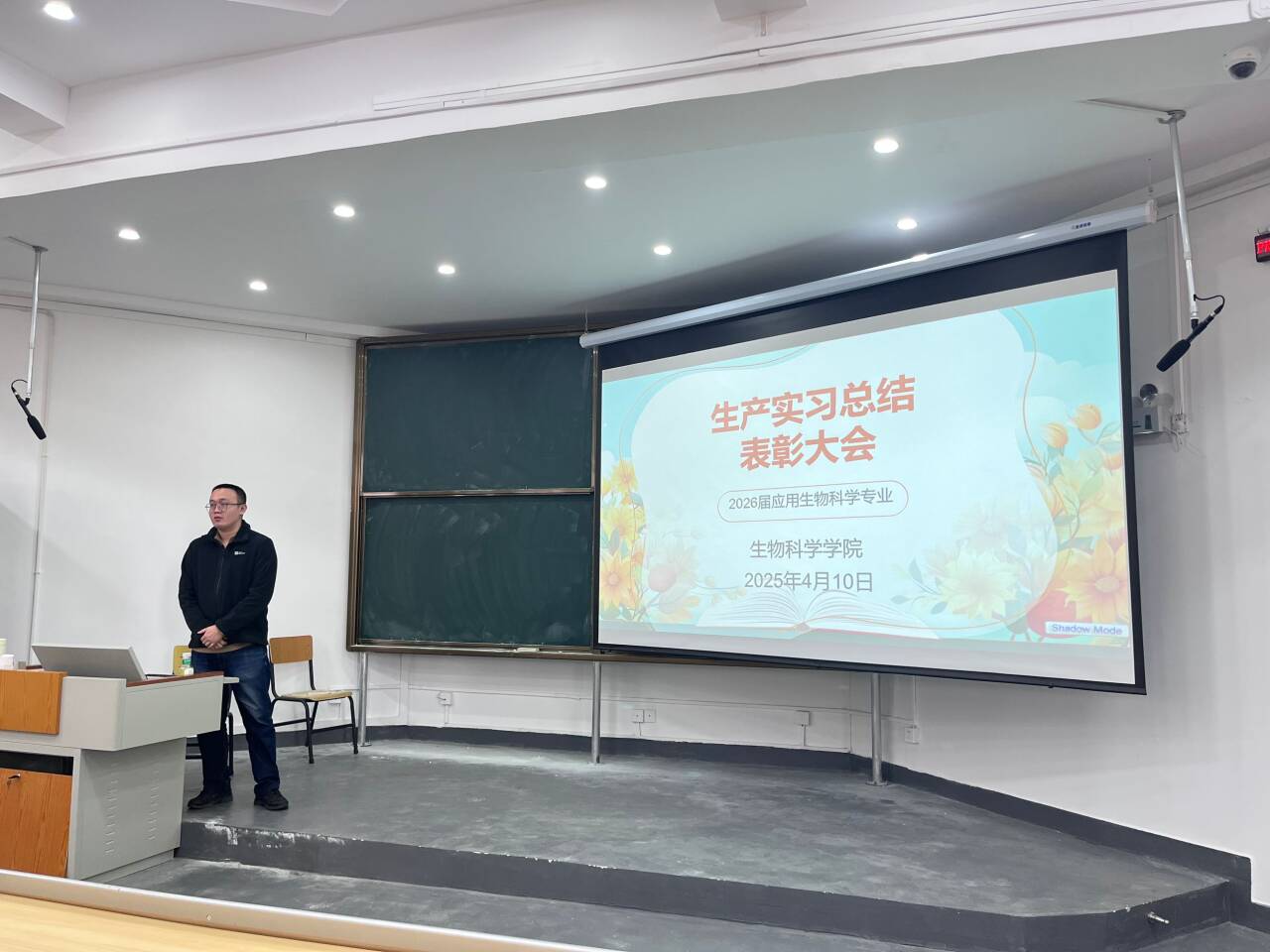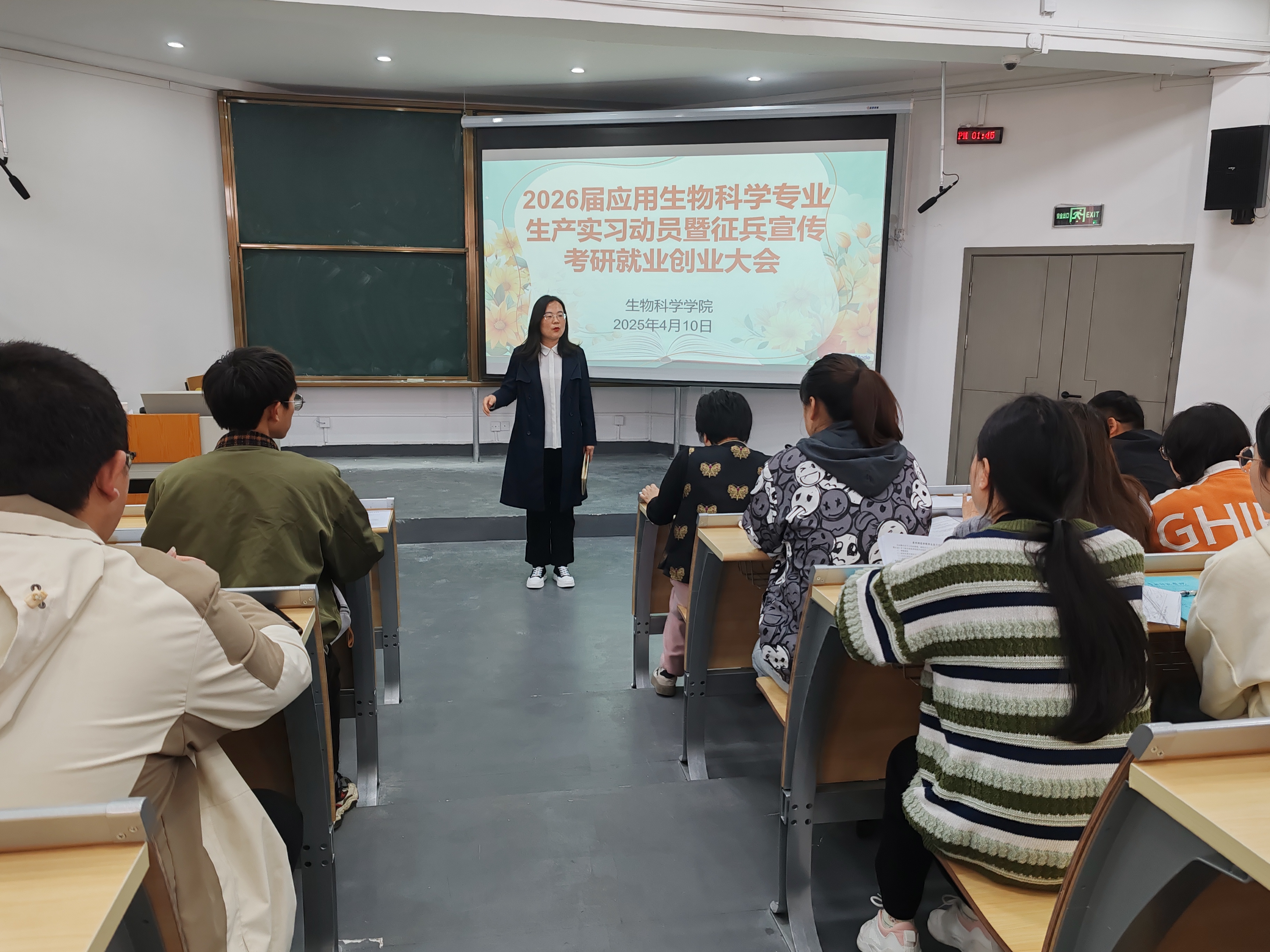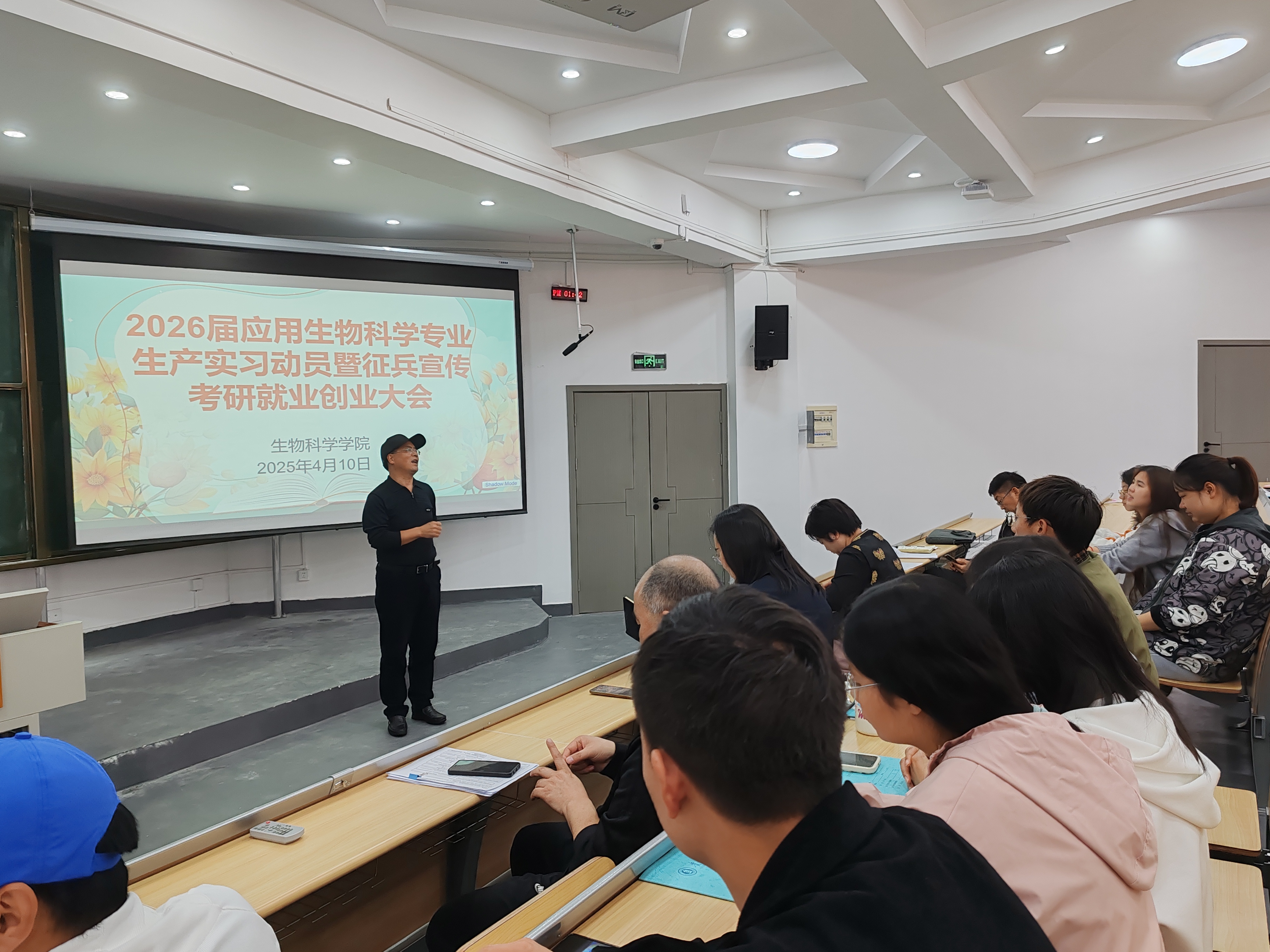 為深化產(chǎn)教融合、落實實踐育人理念,進一步推動應用生物科學專業(yè)學生理論與實踐能力雙提升,生物科學學院于4月10日在寧靜樓537教室召開了2026屆應用生物科學專業(yè)生產(chǎn)實習動員總結(jié)暨征兵宣傳考研就業(yè)創(chuàng)業(yè)大會。參加會議的有學院黨委書記孫秀華、院長兼黨委副書記任翠娟、黨委副書記王玨、副院長錢長江、副院長孟澤彬、系主任程搏幸、輔導員李育芳、生產(chǎn)實習兼職管理員陳運澤、學生導師彭雪梅、學生導師蘭世超、2022級應用生物科學專業(yè)全體同學及2021級應用生物科學專業(yè)學生代表,會議由陳運澤主持。