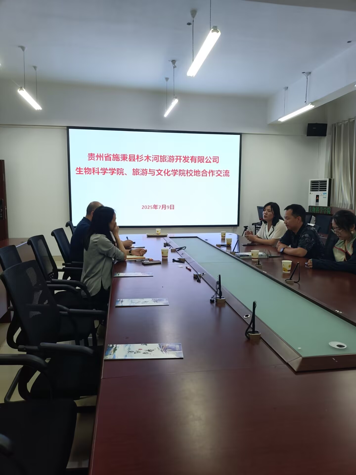 為深化校地合作,7月9日,貴州省施秉縣杉木河旅游開發(fā)有限公司與生物科學(xué)學(xué)院、旅游與文化學(xué)院開展校地合作交流。貴州省施秉縣杉木河旅游開發(fā)有限公司經(jīng)理王鋒等四人,旅游與文化學(xué)院副院長(zhǎng)費(fèi)廣玉、生物科學(xué)學(xué)院副院長(zhǎng)孟澤彬參加會(huì)議。