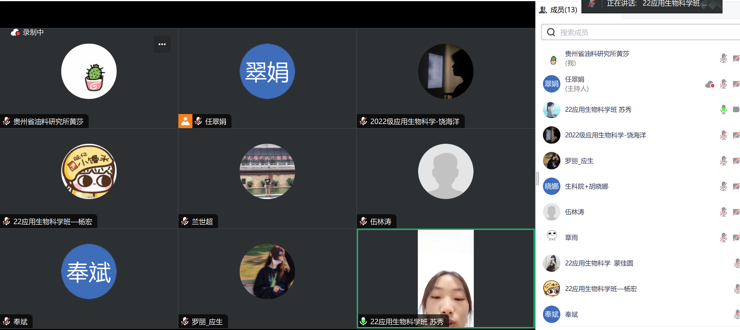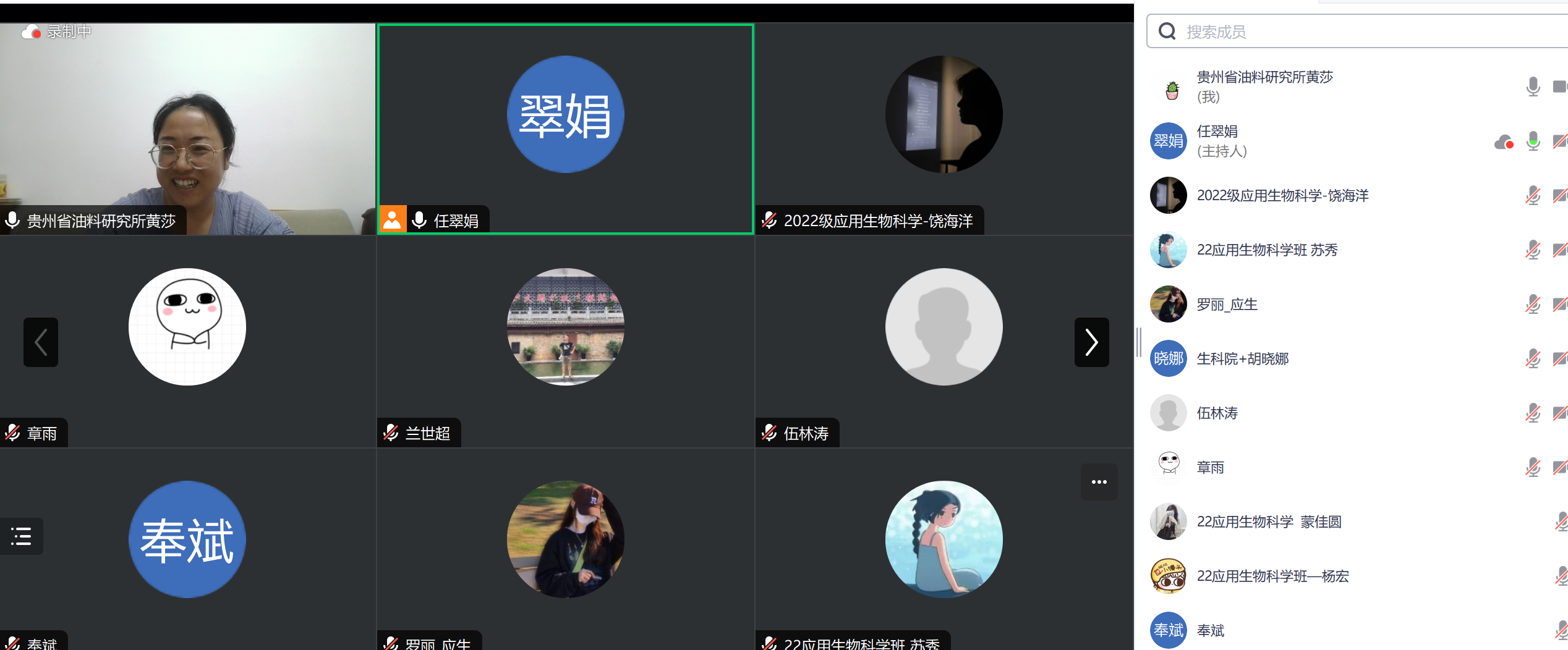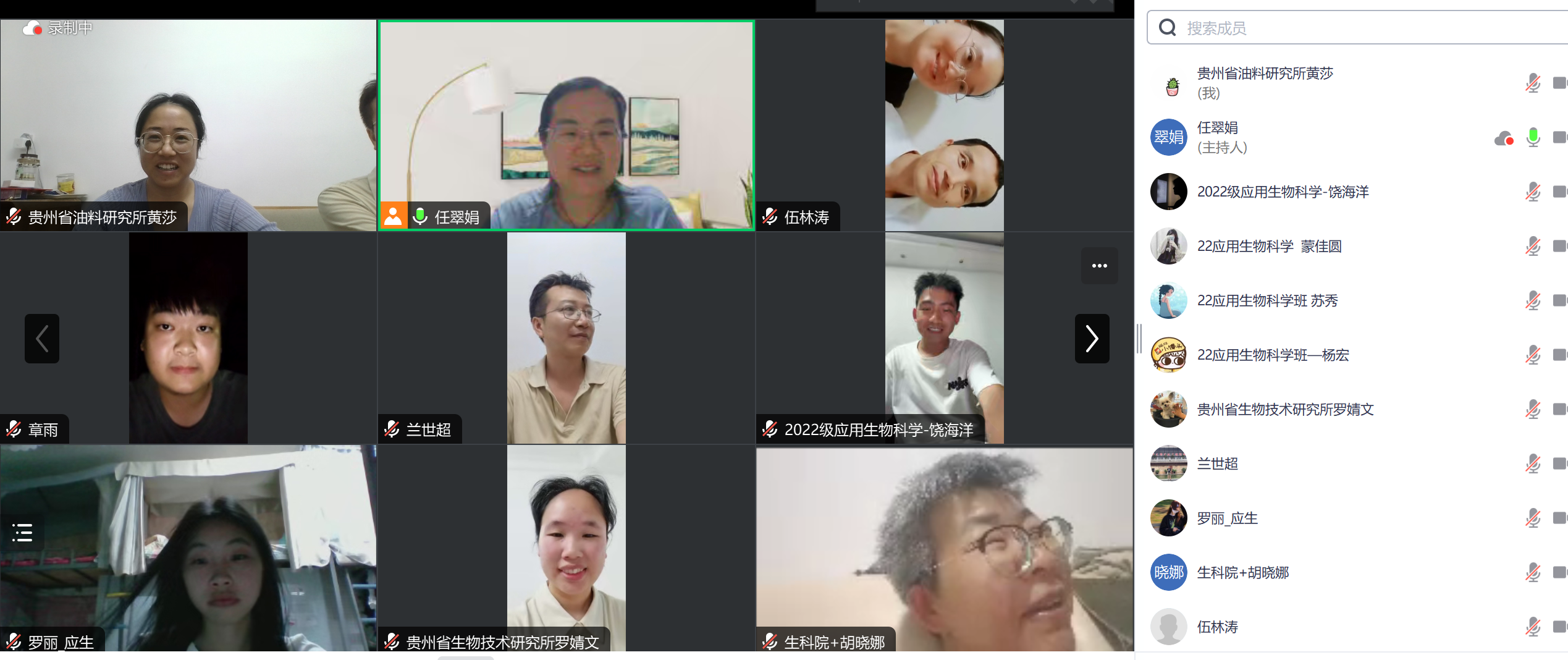 為深化產(chǎn)教融合實(shí)效,精準(zhǔn)把脈實(shí)習(xí)質(zhì)量,2025年8月6日晚,生物科學(xué)學(xué)院通過(guò)騰訊會(huì)議平臺(tái)召開(kāi)2026屆應(yīng)用生物科學(xué)專業(yè)生產(chǎn)實(shí)習(xí)線上巡視(第二小組)座談會(huì)。學(xué)院院長(zhǎng)任翠娟主持會(huì)議,校外實(shí)習(xí)導(dǎo)師奉斌(貴州省油料研究所)、黃莎(貴州省油料研究所)、羅婧文(貴州省生物技術(shù)研究所),校內(nèi)導(dǎo)師伍林濤、蘭世超、胡曉娜及小組5名實(shí)習(xí)生共聚云端,共商實(shí)踐育人新路徑。