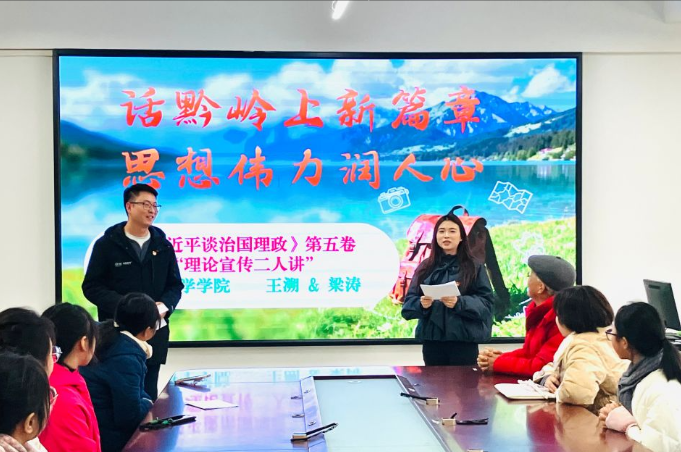 為深入學(xué)習(xí)貫徹習(xí)近平新時代中國特色社會主義思想,生動闡釋《習(xí)近平談治國理政》第五卷的深刻內(nèi)涵與實踐要求,12月26日,生物科學(xué)學(xué)院在寧靜樓611會議室舉辦了一場別開生面的“理論宣傳二人講”宣講活動。本次宣講以“黔嶺大地譜新篇 知行合一向未來”為主題,由理論宣講員、生物科學(xué)專業(yè)學(xué)生黨支部書記王溯和實踐宣講員、野生動物與自然保護區(qū)管理專業(yè)學(xué)生黨支部書記梁濤聯(lián)袂主講。