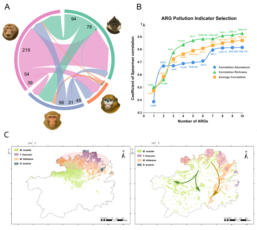 研究進(jìn)一步通過特征優(yōu)化篩選,成功構(gòu)建了由 mdtH、tet(S) 等10個(gè)核心耐藥基因組成的評(píng)價(jià)體系,可高效評(píng)估非人靈長類腸道耐藥基因組的總體負(fù)擔(dān)。相關(guān)性分析表明,人類活動(dòng)強(qiáng)度與耐藥基因豐度呈顯著正相關(guān)。結(jié)合物種分布模型預(yù)測,至2090年,黔金絲猴與黑葉猴的適宜生境將面臨劇烈萎縮。盡管梵凈山、麻陽河等國家級(jí)自然保護(hù)區(qū)仍是其關(guān)鍵避難所,但在氣候變化與人類擾動(dòng)的雙重壓力下,這些區(qū)域極可能演變?yōu)槟退幓蛩綌U(kuò)散的“敏感熱點(diǎn)”。