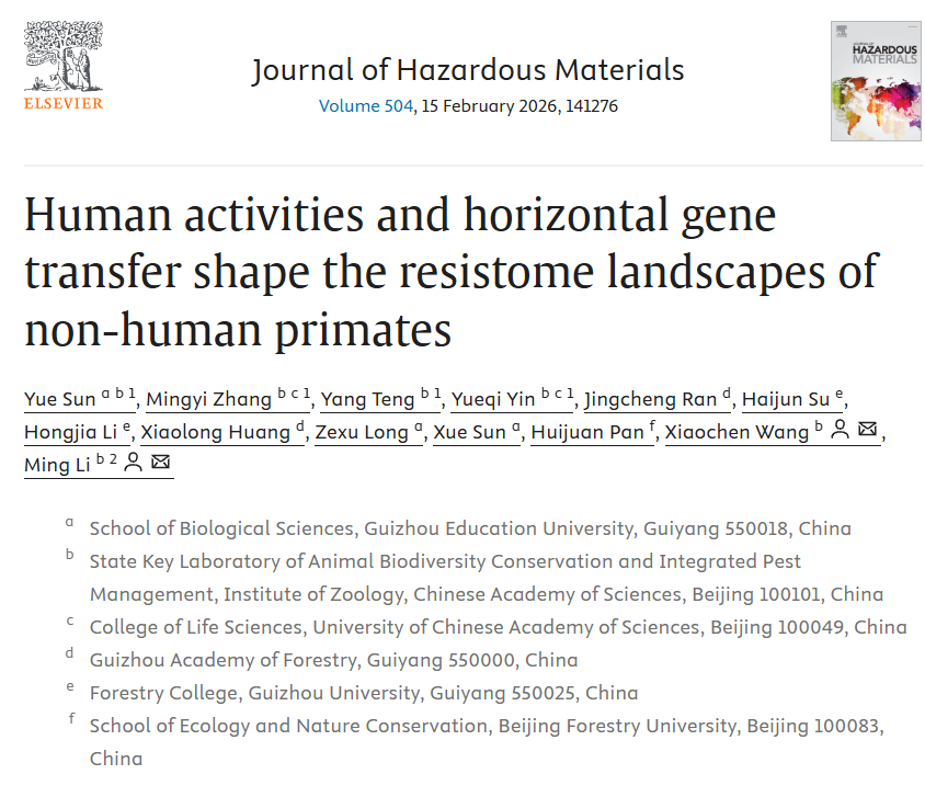本網(wǎng)訊 近日,我校生物科學(xué)學(xué)院孫悅副教授聯(lián)合中國科學(xué)院動(dòng)物研究所李明研究員團(tuán)隊(duì),在環(huán)境科學(xué)領(lǐng)域國際頂級(jí)期刊《Journal of Hazardous Materials》(中科院一區(qū)TOP,IF:11.2)上發(fā)表了題為“Human activities and horizontal gene transfer shape the resistome landscapes of non-human primates”的研究論文。該研究通過整合宏基因組學(xué)與生態(tài)建模手段,系統(tǒng)揭示了人類活動(dòng)與水平基因轉(zhuǎn)移如何共同塑造靈長類動(dòng)物的耐藥組景觀,為環(huán)境耐藥性風(fēng)險(xiǎn)評(píng)估與生物多樣性保護(hù)提供了重要的科學(xué)依據(jù)。