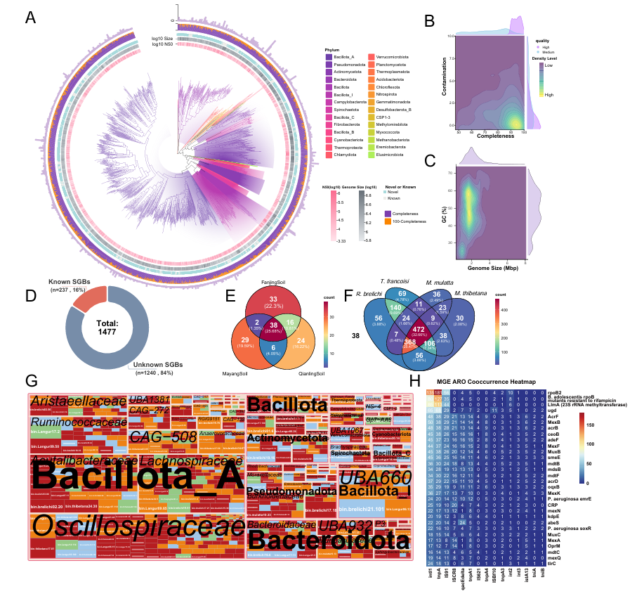 研究團(tuán)隊(duì)以貴州省內(nèi)黔金絲猴、黑葉猴、藏酋猴及獼猴等四種非人靈長類及其生境土壤進(jìn)行了深度分析,累計(jì)數(shù)據(jù)量達(dá)932.62 GB。基于綜合性抗生素抗性數(shù)據(jù)庫(CARD),共鑒定出涵蓋115個(gè)類別及9種機(jī)制的1,927種抗生素耐藥基因。通過構(gòu)建高分辨率基因組圖譜,團(tuán)隊(duì)成功組裝出1,477個(gè)物種水平基因組,其中84%為未知新物種,主要隸屬于厚壁菌門與擬桿菌門。研究發(fā)現(xiàn),受人類活動(dòng)干預(yù)較強(qiáng)的黔靈山獼猴種群,其抗生素耐藥基因豐度顯著最高。系統(tǒng)發(fā)育與水平基因轉(zhuǎn)移分析顯示,在10,599次水平基因轉(zhuǎn)移事件中,假單胞菌屬(Pseudomonas)、寡養(yǎng)單胞菌屬(Stenotrophomonas)和叢毛單胞菌屬(Comamonas)是驅(qū)動(dòng)耐藥基因跨物種擴(kuò)散的核心菌屬。值得關(guān)注的是,盡管黔金絲猴進(jìn)化出如f_CAG-508等特異性菌群,但其HGT頻率最低(僅23次);而分布廣泛的藏酋猴雖耐藥豐度并非最高,卻參與了近半數(shù)的HGT事件(312次)。這一結(jié)果證實(shí)了物種分布格局與基因流動(dòng)態(tài)的內(nèi)在聯(lián)系:廣布種具有更高的遺傳交換頻率,而黔金絲猴所處的“孤島”生境及其分布局限性,有效降低了耐藥基因的水平擴(kuò)散風(fēng)險(xiǎn)。