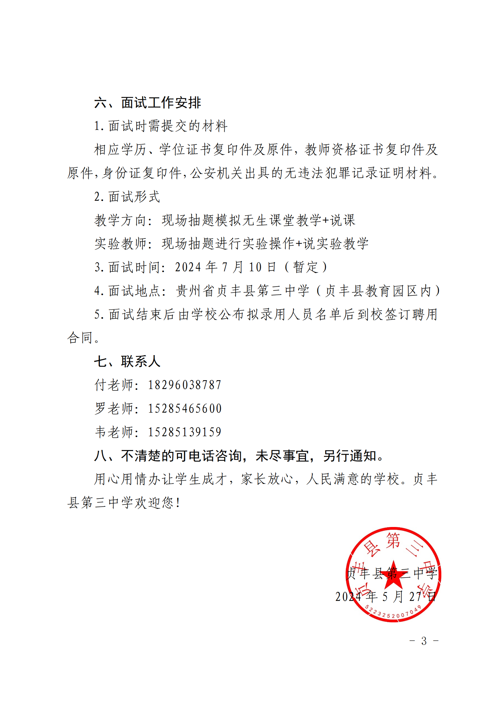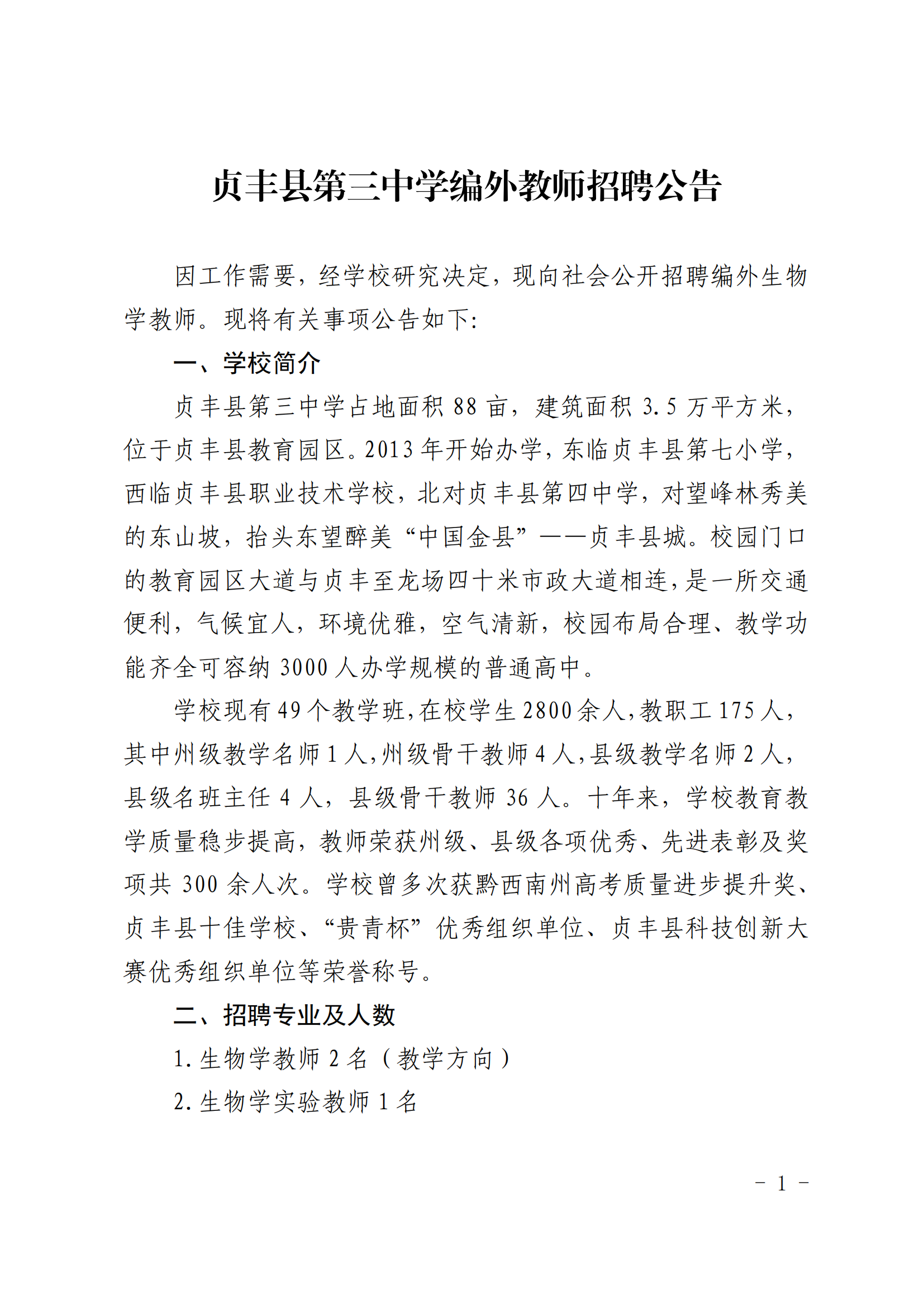 【教師招聘】貞豐縣第三中學編外教師招聘公告