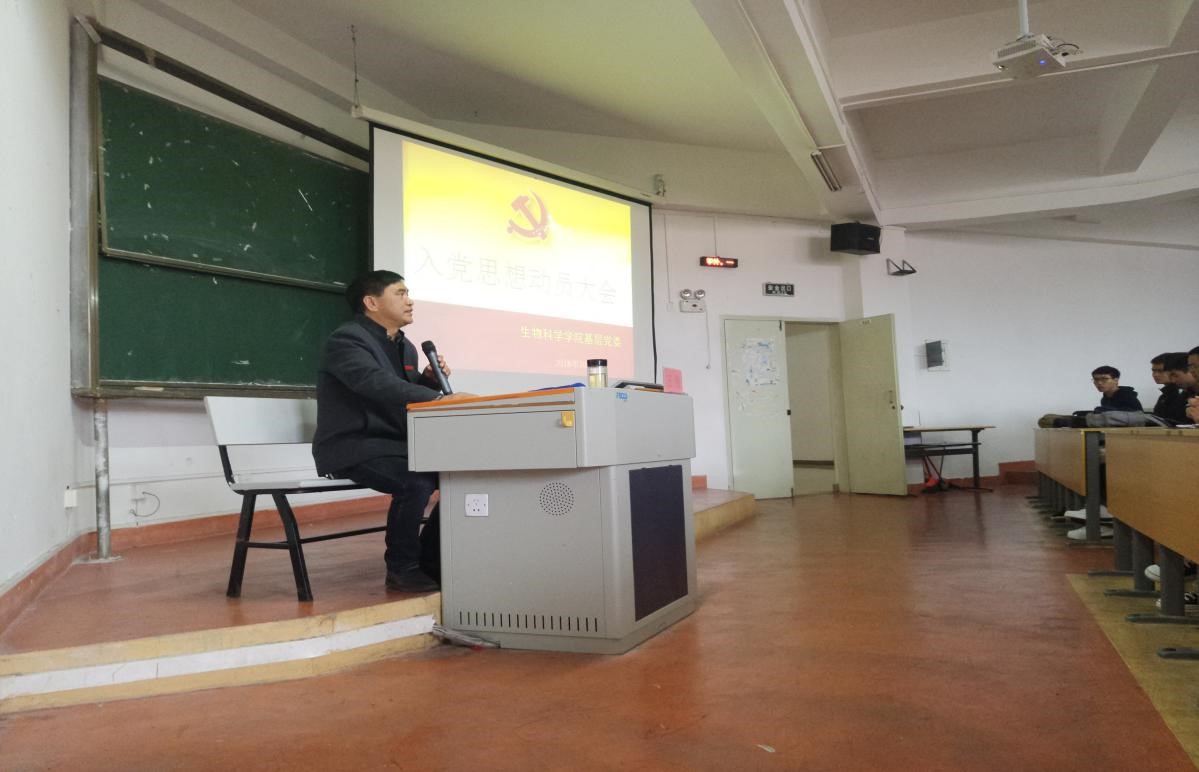 10月19日中午,生物科學(xué)學(xué)院黨委書記王剛在寧靜樓535教室給2018級新生上黨課,2018級寄交入黨申請書的一百多名同學(xué)參加了此次黨課。