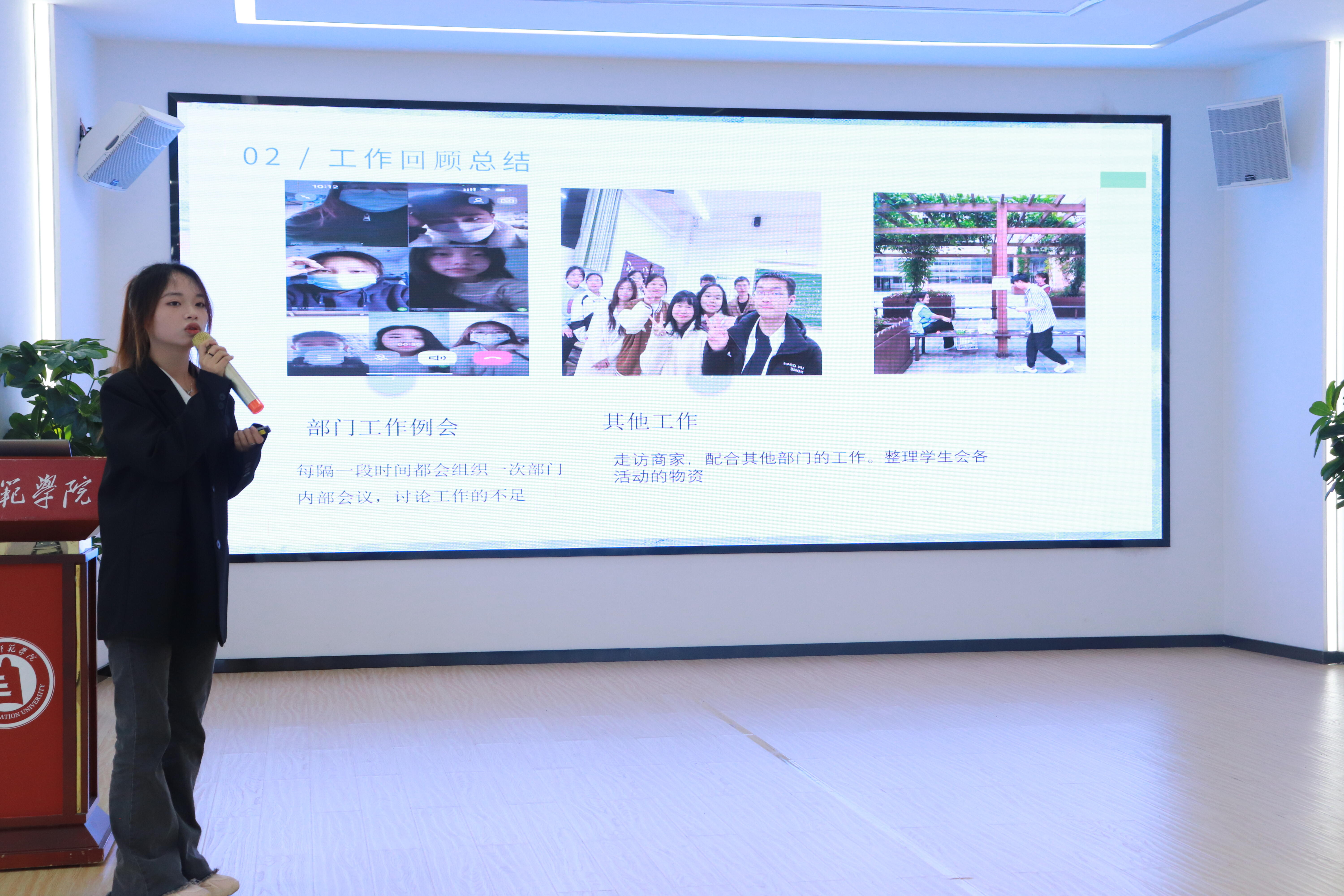 首先,由主持人介紹本次活動的匯報規(guī)則,隨后學(xué)生會第六屆見習主席團及各部門干部依次上臺進行匯報。各干部以端莊大方的儀態(tài)和飽滿的精神狀態(tài)走上講臺,就自己的基本情況、工作中遇到的問題以及對部門未來的規(guī)劃進行匯報,并提出改進措施。每個部門的匯報從核心出發(fā),結(jié)合部門自身特點,向全體成員展示了部門風采和未來規(guī)劃。大會最后,由王玨對本次匯報進行總結(jié),她提出:希望各位干部在接下來的工作中不要局限于表面問題,應(yīng)進行更深入的了解與思考,提出問題并積極改正。同時,也希望各干部能在未來的工作中不斷提升自身綜合能力,鍛煉堅實的本領(lǐng),面向更好的未來。匯報至此接近尾聲,全體成員合影留念。