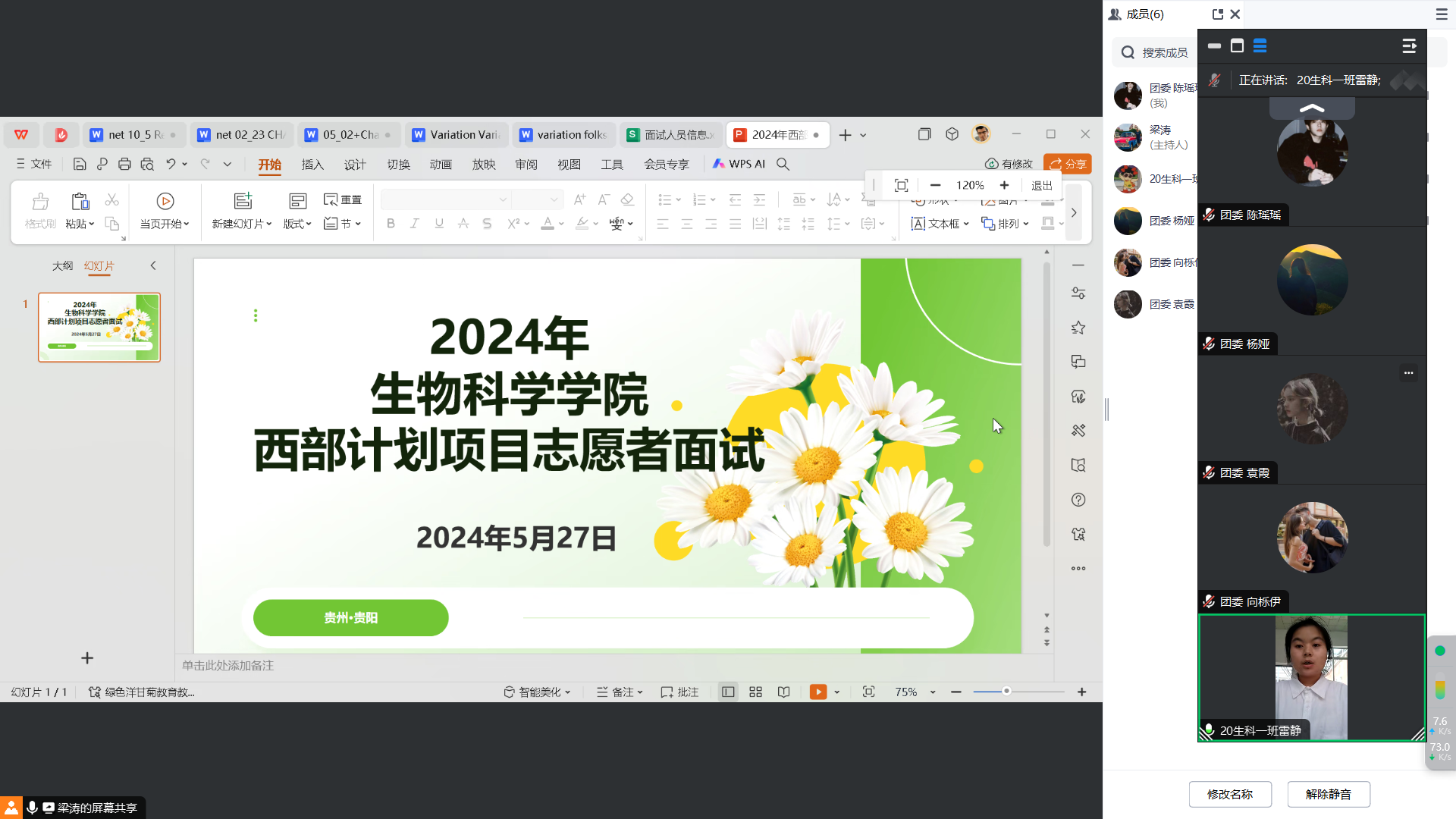 2024年5月27日,生物科學(xué)學(xué)院基層團(tuán)委組織了2024屆畢業(yè)生西部志愿者計(jì)劃崗位面試。本次面試在騰訊會(huì)議線上平臺(tái)進(jìn)行,由我院黨委副書記王玨、團(tuán)委書記及團(tuán)委學(xué)生會(huì)主席團(tuán)成員擔(dān)任面試官。共有來自生物科學(xué)學(xué)院貴州師范本部及聯(lián)合培養(yǎng)的貴州農(nóng)業(yè)職業(yè)學(xué)院專升本的24名合格畢業(yè)生參加此次面試。